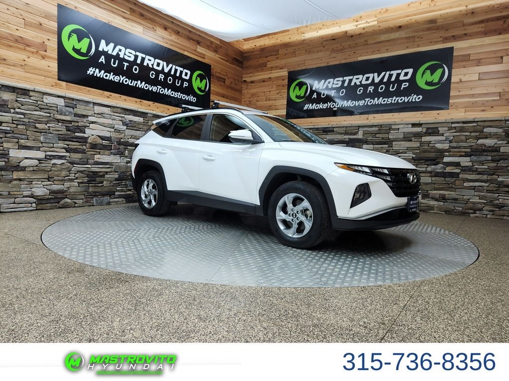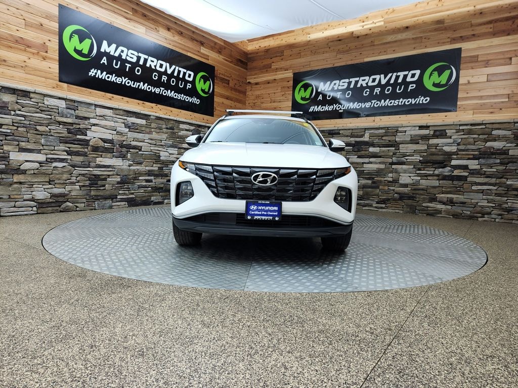2023 Hyundai Tucson SEL Certified. Serenity White Pearl This Tucson SEL is nicely equipped with Option Group 01, Hyundai Certified Used Vehicles Certified, AWD, 3.648 Axle Ratio, 4-Wheel Disc Brakes, 6 Speakers, ABS brakes, Air Conditioning, Alloy wheels, AM/FM radio: SiriusXM, Apple CarPlay & Android Auto, Auto High-beam Headlights, Brake assist, Bumpers: body-color, Carpeted Floor Mats, Delay-off headlights, Driver door bin, Driver vanity mirror, Dual front impact airbags, Dual front side impact airbags, Electronic Stability Control, Emergency communication system: Blue Link Connected Car Service (3-year complimentary subscription), Four wheel independent suspension, Front anti-roll bar, Front Bucket Seats, Front Center Armrest, Front reading lights, Fully automatic headlights, H-Tex Seat Trim, Heated door mirrors, Heated Front Bucket Seats, Heated front seats, Illuminated entry, Low tire pressure warning, Occupant sensing airbag, Outside temperature display, Overhead airbag, Overhead console, Panic alarm, Passenger door bin, Passenger vanity mirror, Power door mirrors, Power driver seat, Power Liftgate, Power steering, Power windows, Radio data system, Radio: AM/FM/HD/SiriusXM Audio System, Rear anti-roll bar, Rear Bumper Applique, Rear seat center armrest, Rear window defroster, Rear window wiper, Remote keyless entry, Roof Rack Cross Rails (DISC), Roof rack: rails only, Security system, Speed control, Split folding rear seat, Spoiler, Stain & Odor Resistant Cloth Seat Trim, Steering wheel mounted audio controls, Tachometer, Telescoping steering wheel, Tilt steering wheel, Traction control, Trip computer, Turn signal indicator mirrors, Variably intermittent wipers, Wheel Locks, and Wheels: 17" x 7.0J" Alloy. AWD.