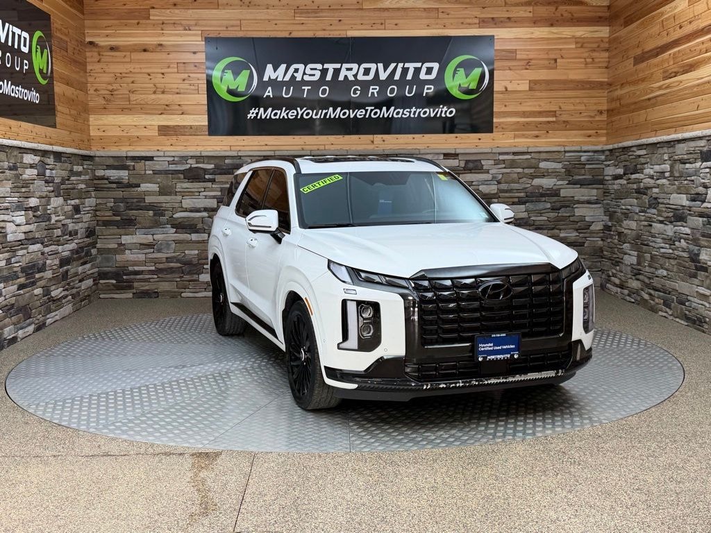 2024 Hyundai Palisade Calligraphy Night Edition Certified. Hyper White This Palisade Calligraphy Night Edition is nicely equipped with Option Group 01, Hyundai Certified Used Vehicles Certified, Navigation System, 12 Speakers, 3.648 Axle Ratio, 3rd row seats: split-bench, 4-Wheel Disc Brakes, ABS brakes, Air Conditioning, Alloy wheels, AM/FM radio: SiriusXM, Apple CarPlay & Android Auto, Auto High-beam Headlights, Auto-dimming door mirrors, Auto-dimming Rear-View mirror, Auto-leveling suspension, Automatic temperature control, Brake assist, Bumper Applique, Bumpers: body-color, Cargo Tray, Carpeted Floor Mats, Compass, Delay-off headlights, Driver door bin, Driver vanity mirror, Dual front impact airbags, Dual front side impact airbags, Electronic Stability Control, Emergency communication system, Exterior Parking Camera Rear, First Aid Kit, Four wheel independent suspension, Front anti-roll bar, Front Bucket Seats, Front Center Armrest, Front dual zone A/C, Front reading lights, Fully automatic headlights, Garage door transmitter: HomeLink, harman/kardon® Speakers, Heads-Up Display, Heated & Ventilated Front Bucket Seats, Heated door mirrors, Heated front seats, Heated rear seats, Heated steering wheel, Illuminated entry, Knee airbag, Low tire pressure warning, Memory seat, Microfiber Suede Seat Trim, Occupant sensing airbag, Outside temperature display, Overhead airbag, Overhead console, Panic alarm, Passenger door bin, Passenger vanity mirror, Power door mirrors, Power driver seat, Power Liftgate, Power moonroof, Power passenger seat, Power steering, Power windows, Radio data system, Radio: AM/FM/MP3 Premium Audio System, Rain sensing wipers, Rear air conditioning, Rear anti-roll bar, Rear audio controls, Rear reading lights, Rear side impact airbag, Rear window defroster, Rear window wiper, Reclining 3rd row seat, Remote keyless entry, Roof rack, Roof Rack Cross Rails, Security system, Speed control, Speed-sensing steering, Split folding rear seat, Spoiler, Steering wheel mounted audio controls, Tachometer, Telescoping steering wheel, Tilt steering wheel, Traction control, Trip computer, Turn signal indicator mirrors, Variably intermittent wipers, Ventilated front seats, Ventilated rear seats, Wheel Locks, and Wheels: 20" x 7.5J Black Liquid Paint Alloy. Navigation System.