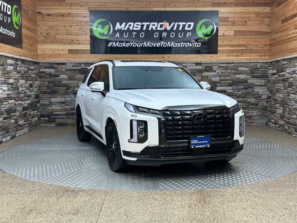 2024 Hyundai Palisade Calligraphy Night Edition Certified. Hyper White This Palisade Calligraphy Night Edition is nicely equipped with Option Group 01, Hyundai Certified Used Vehicles Certified, 12 Speakers, 3.648 Axle Ratio, 3rd row seats: split-bench, 4-Wheel Disc Brakes, ABS brakes, Air Conditioning, Alloy wheels, AM/FM radio: SiriusXM, Apple CarPlay & Android Auto, Auto High-beam Headlights, Auto-dimming door mirrors, Auto-dimming Rear-View mirror, Auto-leveling suspension, Automatic temperature control, Brake assist, Bumpers: body-color, Carpeted Floor Mats, Compass, Delay-off headlights, Driver door bin, Driver vanity mirror, Dual front impact airbags, Dual front side impact airbags, Electronic Stability Control, Emergency communication system, Exterior Parking Camera Rear, Four wheel independent suspension, Front anti-roll bar, Front Bucket Seats, Front Center Armrest, Front dual zone A/C, Front reading lights, Fully automatic headlights, Garage door transmitter: HomeLink, harman/kardon® Speakers, Heads-Up Display, Heated & Ventilated Front Bucket Seats, Heated door mirrors, Heated front seats, Heated rear seats, Heated steering wheel, Illuminated entry, Knee airbag, Low tire pressure warning, Memory seat, Microfiber Suede Seat Trim, Navigation System, Occupant sensing airbag, Outside temperature display, Overhead airbag, Overhead console, Panic alarm, Passenger door bin, Passenger vanity mirror, Power door mirrors, Power driver seat, Power Liftgate, Power moonroof, Power passenger seat, Power steering, Power windows, Radio data system, Radio: AM/FM/MP3 Premium Audio System, Rain sensing wipers, Rear air conditioning, Rear anti-roll bar, Rear audio controls, Rear reading lights, Rear side impact airbag, Rear window defroster, Rear window wiper, Reclining 3rd row seat, Remote keyless entry, Roof rack, Security system, Speed control, Speed-sensing steering, Split folding rear seat, Spoiler, Steering wheel mounted audio controls, Tachometer, Telescoping steering wheel, Tilt steering wheel, Traction control, Trip computer, Turn signal indicator mirrors, Variably intermittent wipers, Ventilated front seats, Ventilated rear seats, and Wheels: 20" x 7.5J Black Liquid Paint Alloy.