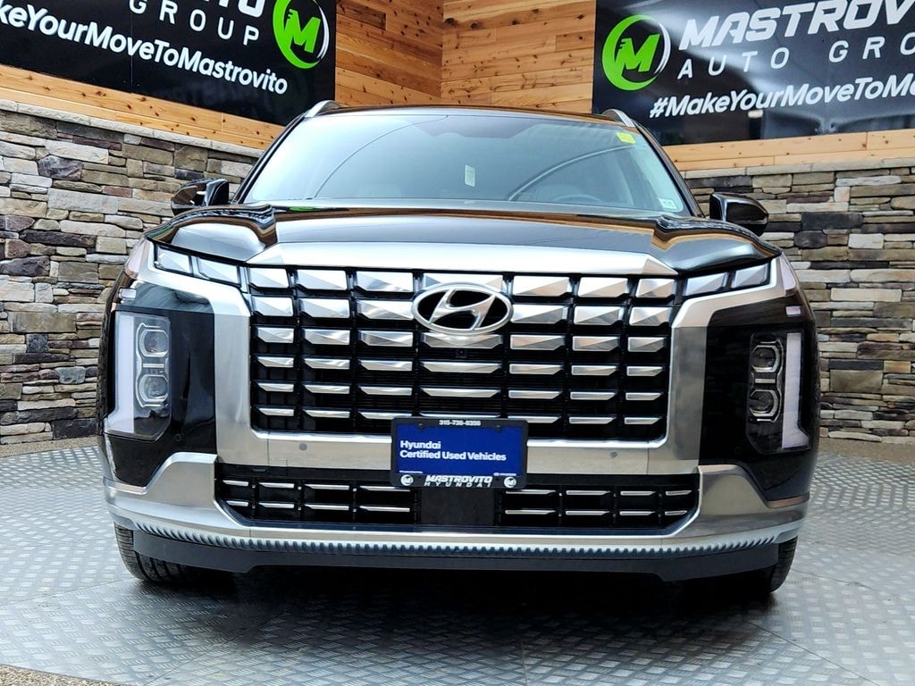 2024 Hyundai Palisade Calligraphy Certified. Abyss Black Pearl This Palisade Calligraphy is nicely equipped with Option Group 01, Hyundai Certified Used Vehicles Certified, 12 Speakers, 3.648 Axle Ratio, 3rd row seats: split-bench, 4-Wheel Disc Brakes, ABS brakes, Air Conditioning, Alloy wheels, AM/FM radio: SiriusXM, Apple CarPlay & Android Auto, Auto High-beam Headlights, Auto-dimming door mirrors, Auto-dimming Rear-View mirror, Auto-leveling suspension, Automatic temperature control, Brake assist, Bumper Applique, Bumpers: body-color, Cargo Cover/Screen, Cargo Tray, Carpeted Floor Mats, Compass, Delay-off headlights, Driver door bin, Driver vanity mirror, Dual front impact airbags, Dual front side impact airbags, Electronic Stability Control, Emergency communication system, Exterior Parking Camera Rear, First Aid Kit, Four wheel independent suspension, Front anti-roll bar, Front Bucket Seats, Front Center Armrest, Front dual zone A/C, Front reading lights, Fully automatic headlights, Garage door transmitter: HomeLink, harman/kardon® Speakers, Heads-Up Display, Heated & Ventilated Front Bucket Seats, Heated door mirrors, Heated front seats, Heated rear seats, Heated steering wheel, Illuminated entry, Knee airbag, Low tire pressure warning, Memory seat, Navigation System, Occupant sensing airbag, Outside temperature display, Overhead airbag, Overhead console, Panic alarm, Passenger door bin, Passenger vanity mirror, Power door mirrors, Power driver seat, Power Liftgate, Power moonroof, Power passenger seat, Power steering, Power windows, Premium Nappa Leather Seat Trim, Radio data system, Radio: AM/FM/MP3 Premium Audio System, Rain sensing wipers, Rear air conditioning, Rear anti-roll bar, Rear audio controls, Rear reading lights, Rear side impact airbag, Rear window defroster, Rear window wiper, Reclining 3rd row seat, Remote keyless entry, Roadside Assistance Kit, Security system, Speed control, Speed-sensing steering, Split folding rear seat, Spoiler, Steering wheel mounted audio controls, Tachometer, Telescoping steering wheel, Tilt steering wheel, Traction control, Trip computer, Turn signal indicator mirrors, Variably intermittent wipers, Ventilated front seats, Ventilated rear seats, Wheel Locks, and Wheels: 20" x 7.5J Calligraphy Exclusive Alloy.