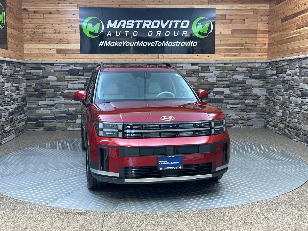 2024 Hyundai Santa Fe Limited Certified. Ultimate Red This Santa Fe Limited is nicely equipped with Option Group 01, Hyundai Certified Used Vehicles Certified, AWD, Gray Leather, 12 Speakers, 3rd row seats: bench, 4-Wheel Disc Brakes, ABS brakes, Air Conditioning, Alloy wheels, AM/FM radio: SiriusXM, Apple CarPlay & Android Auto, Auto High-beam Headlights, Auto-dimming Rear-View mirror, Automatic temperature control, Axle Ratio: 3.316, Brake assist, Bumpers: body-color, Cargo Blocks, Carpeted Floor Mats, Delay-off headlights, Driver door bin, Driver vanity mirror, Dual front impact airbags, Dual front side impact airbags, Electronic Stability Control, Emergency communication system, Exterior Parking Camera Rear, First Aid Kit, Four wheel independent suspension, Front anti-roll bar, Front Bucket Seats, Front Center Armrest, Front dual zone A/C, Front reading lights, Fully automatic headlights, Garage door transmitter: HomeLink, Heated & Ventilated Front Bucket Seats, Heated door mirrors, Heated front seats, Heated rear seats, Heated steering wheel, Illuminated entry, Knee airbag, Leather Seat Trim, Leather steering wheel, Low tire pressure warning, Memory seat, Navigation System, Occupant sensing airbag, Outside temperature display, Overhead airbag, Overhead console, Panic alarm, Passenger door bin, Passenger vanity mirror, Power door mirrors, Power driver seat, Power Liftgate, Power moonroof, Power passenger seat, Power steering, Power windows, Radio: AM/FM/HD Bose Premium Audio System, Rain sensing wipers, Rear anti-roll bar, Rear seat center armrest, Rear side impact airbag, Rear window defroster, Rear window wiper, Remote keyless entry, Roadside Assistance Kit, Security system, Speed control, Speed-sensing steering, Split folding rear seat, Spoiler, Steering wheel mounted audio controls, Tachometer, Telescoping steering wheel, Tilt steering wheel, Traction control, Trip computer, Turn signal indicator mirrors, Variably intermittent wipers, Ventilated front seats, and Wheels: 20" x 8.5J Alloy. AWD, Gray Leather.