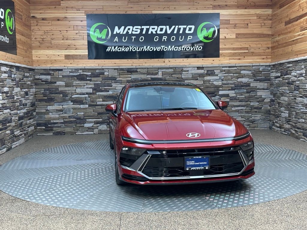 2024 Hyundai Sonata Hybrid Limited Certified. Ultimate red This Sonata Hybrid Limited is nicely equipped with Option Group 01, Hyundai Certified Used Vehicles Certified, I4, 12 Speakers, 17" x 7.0J Aluminum Alloy Wheels, 4-Wheel Disc Brakes, ABS brakes, Air Conditioning, Alloy wheels, AM/FM radio: SiriusXM, Apple CarPlay & Android Auto, Auto High-beam Headlights, Auto-dimming Rear-View mirror, Automatic temperature control, Brake assist, Bumpers: body-color, Cargo Tray, Carpeted Floor Mats, Delay-off headlights, Driver door bin, Driver vanity mirror, Dual front impact airbags, Dual front side impact airbags, Electronic Stability Control, Emergency communication system: Bluelink, First Aid Kit, Four wheel independent suspension, Front anti-roll bar, Front Bucket Seats, Front Center Armrest, Front dual zone A/C, Front reading lights, Fully automatic headlights, Heads-Up Display, Heated & Ventilated Front Bucket Seats, Heated door mirrors, Heated front seats, Heated steering wheel, Illuminated entry, Knee airbag, Lane Departure Warning System, Leather Seating Surfaces, Leather steering wheel, Low tire pressure warning, Memory seat, Mud Guards, Navigation System, Occupant sensing airbag, Outside temperature display, Overhead airbag, Overhead console, Panic alarm, Passenger door bin, Passenger vanity mirror, Power door mirrors, Power driver seat, Power moonroof, Power passenger seat, Power steering, Power windows, Radio data system, Radio: AM/FM/HD/SiriusXM, Rain sensing wipers, Rear anti-roll bar, Rear seat center armrest, Rear side impact airbag, Rear window defroster, Remote keyless entry, Security system, Speed control, Speed-sensing steering, Speed-Sensitive Wipers, Split folding rear seat, Spoiler, Steering wheel mounted audio controls, Tachometer, Telescoping steering wheel, Tilt steering wheel, Traction control, Trip computer, Trunk Cargo Net, Variably intermittent wipers, and Ventilated front seats. I4.