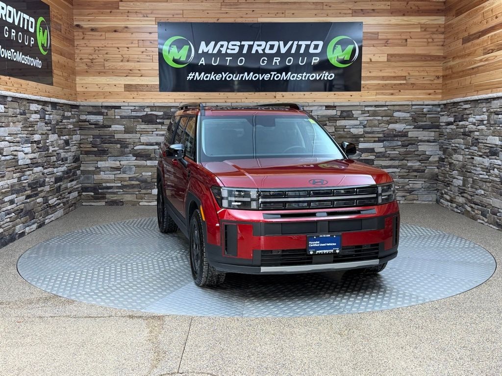 2025 Hyundai Santa Fe XRT Certified. Ultimate Red This Santa Fe XRT is nicely equipped with Option Group 01, Hyundai Certified Used Vehicles Certified, AWD, Black Artificial Leather, 3rd row seats: bench, 4-Wheel Disc Brakes, 6 Speakers, ABS brakes, Air Conditioning, All Season Fitted Liners, Alloy wheels, AM/FM radio: SiriusXM, Apple CarPlay & Android Auto, Auto High-beam Headlights, Automatic temperature control, Brake assist, Bumpers: body-color, Cargo Net, Delay-off headlights, Driver door bin, Driver vanity mirror, Dual front impact airbags, Dual front side impact airbags, Electronic Stability Control, Emergency communication system, Exterior Parking Camera Rear, First Aid Kit, Four wheel independent suspension, Front anti-roll bar, Front Bucket Seats, Front Center Armrest, Front dual zone A/C, Front reading lights, Fully automatic headlights, H-Tex Leatherette Seat Trim, Heated door mirrors, Heated Front Bucket Seats, Heated front seats, Illuminated entry, Knee airbag, Leather steering wheel, Low tire pressure warning, Navigation System, Occupant sensing airbag, Outside temperature display, Overhead airbag, Overhead console, Panic alarm, Passenger door bin, Passenger vanity mirror, Power door mirrors, Power driver seat, Power Liftgate, Power moonroof, Power steering, Power windows, Radio: AM/FM/HD Display Audio, Rear anti-roll bar, Rear seat center armrest, Rear side impact airbag, Rear window defroster, Rear window wiper, Remote keyless entry, Roadside Assistance Kit, Security system, Speed control, Speed-sensing steering, Split folding rear seat, Spoiler, Steering wheel mounted audio controls, Tachometer, Telescoping steering wheel, Tilt steering wheel, Traction control, Trip computer, Turn signal indicator mirrors, Variably intermittent wipers, Wheel Locks, and Wheels: 18" x 7.5J Dark Alloy. AWD, Black Artificial Leather.