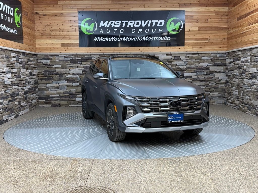 2025 Hyundai Tucson Limited Certified. Ecotronic Gray Matte This Tucson Limited is nicely equipped with Option Group 01, Hyundai Certified Used Vehicles Certified, AWD, Navigation System, 19" Alloy Wheels, 4-Wheel Disc Brakes, 8 Speakers, ABS brakes, Air Conditioning, All Season Fitted Liners, Alloy wheels, AM/FM radio: SiriusXM, Apple CarPlay & Android Auto, Auto High-beam Headlights, Auto-dimming Rear-View mirror, Automatic temperature control, Brake assist, Bumpers: body-color, Cargo Net, Cargo Organizer, Cargo Tray, Delay-off headlights, Driver door bin, Driver vanity mirror, Dual front impact airbags, Dual front side impact airbags, Electronic Stability Control, Emergency communication system: Bluelink+, First Aid Kit, Four wheel independent suspension, Front anti-roll bar, Front Bucket Seats, Front Center Armrest, Front dual zone A/C, Front reading lights, Fully automatic headlights, Garage door transmitter: HomeLink, Heads-Up Display, Heated & Ventilated Front Bucket Seats, Heated door mirrors, Heated front seats, Heated rear seats, Heated steering wheel, Illuminated entry, Leather steering wheel, Leather-Trimmed Seat Trim, Low tire pressure warning, Memory seat, Occupant sensing airbag, Outside temperature display, Overhead airbag, Overhead console, Panic alarm, Passenger door bin, Passenger vanity mirror, Power door mirrors, Power driver seat, Power Liftgate, Power moonroof, Power passenger seat, Power steering, Power windows, Radio data system, Radio: Bose Premium w/AM/FM/HD Audio System, Rain sensing wipers, Rear anti-roll bar, Rear reading lights, Rear seat center armrest, Rear side impact airbag, Rear window defroster, Rear window wiper, Remote keyless entry, Security system, Speed control, Split folding rear seat, Spoiler, Steering wheel mounted audio controls, Tachometer, Telescoping steering wheel, Tilt steering wheel, Traction control, Trip computer, Turn signal indicator mirrors, Variably intermittent wipers, Ventilated front seats, and Wheel Locks. AWD, Navigation System.