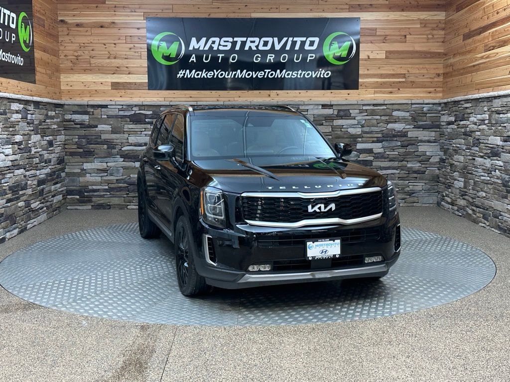 2022 Kia Telluride SX Ebony Black This Telluride SX is nicely equipped with Navigation System, 10 Speakers, 3.648 Axle Ratio, 3rd row seats: split-bench, 4-Wheel Disc Brakes, ABS brakes, Air Conditioning, Alloy wheels, AM/FM radio: SiriusXM, Apple CarPlay & Android Auto, Auto High-beam Headlights, Auto-dimming Rear-View mirror, Automatic temperature control, Brake assist, Bumpers: body-color, Carpeted Floor Mats, Compass, Delay-off headlights, Driver door bin, Driver vanity mirror, Dual front impact airbags, Dual front side impact airbags, Electronic Stability Control, Emergency communication system: 911 Connect, Four wheel independent suspension, Front anti-roll bar, Front Bucket Seats, Front Center Armrest, Front dual zone A/C, Front fog lights, Front reading lights, Fully automatic headlights, Garage door transmitter: HomeLink, harman/kardon® Speakers, Heated & Ventilated Front Bucket Seats, Heated door mirrors, Heated front seats, Heated steering wheel, Illuminated entry, Knee airbag, Leather Seat Trim, Leather Shift Knob, Leather steering wheel, Low tire pressure warning, Memory seat, Occupant sensing airbag, Outside temperature display, Overhead airbag, Overhead console, Panic alarm, Passenger door bin, Passenger vanity mirror, Power door mirrors, Power driver seat, Power Liftgate, Power moonroof, Power passenger seat, Power steering, Power windows, Radio data system, Radio: AM/FM harman/kardon Audio System, Rear air conditioning, Rear anti-roll bar, Rear audio controls, Rear reading lights, Rear window defroster, Rear window wiper, Reclining 3rd row seat, Remote keyless entry, Roof rack: rails only, Security system, Smart Key w/ Push Button and Remote Start, Speed control, Speed-sensing steering, Split folding rear seat, Spoiler, Steering wheel mounted audio controls, Tachometer, Telescoping steering wheel, Tilt steering wheel, Traction control, Trip computer, Turn signal indicator mirrors, Variably intermittent wipers, Ventilated front seats, and Wheels: 20" x 7.5" Black Alloy. Navigation System.